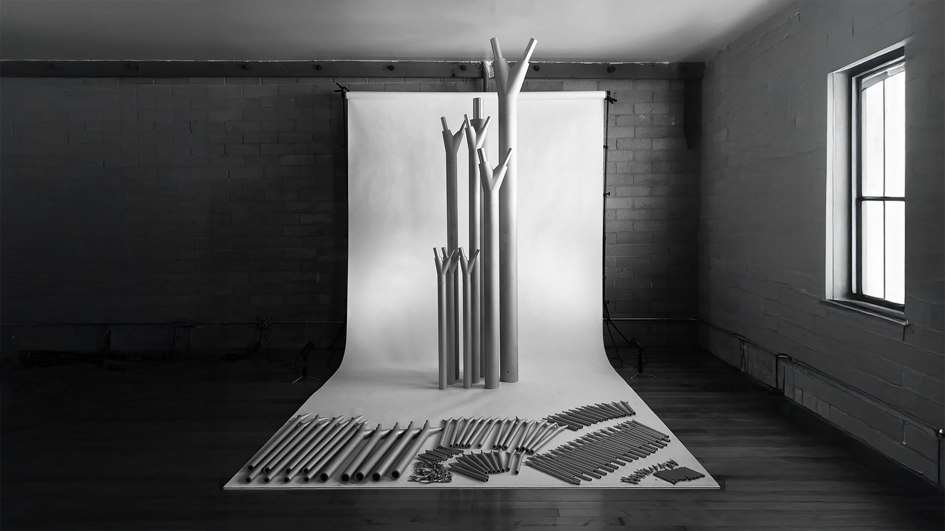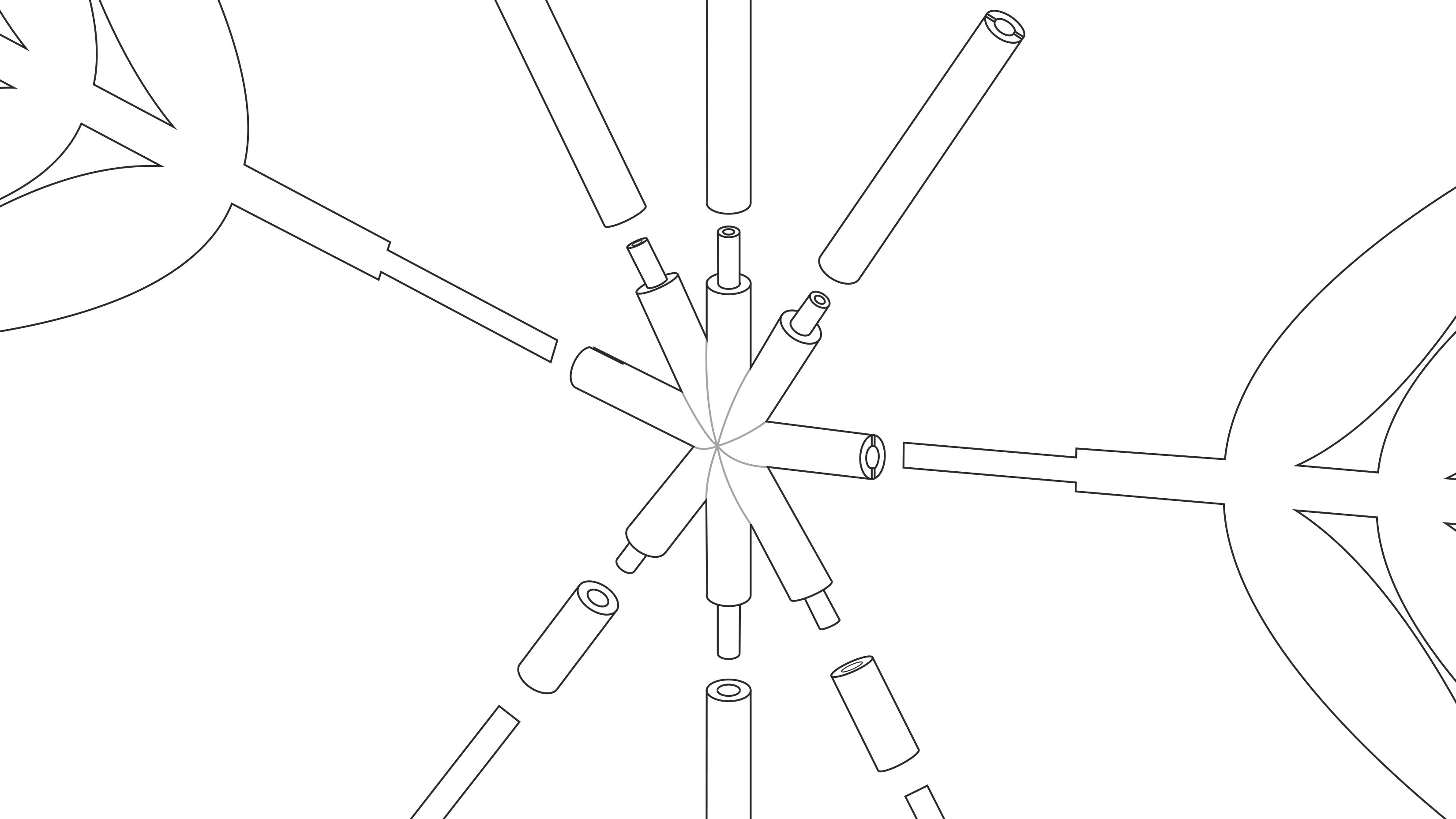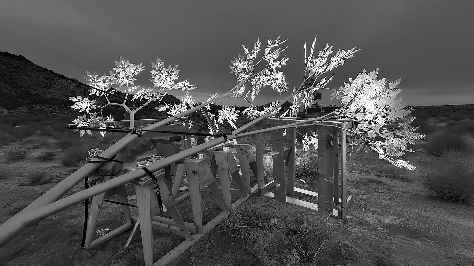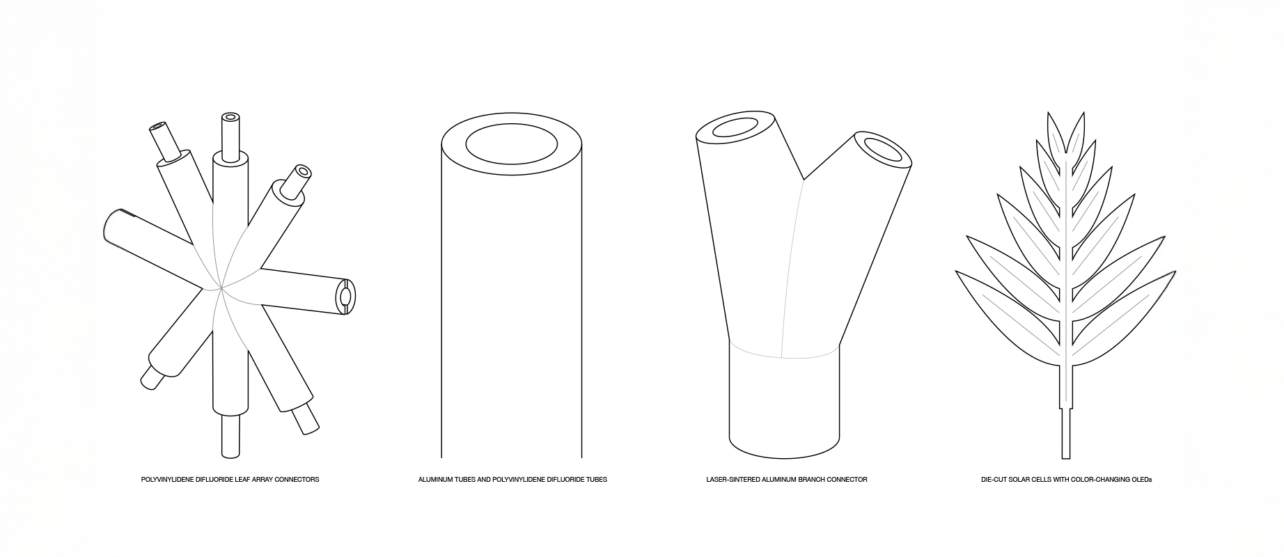 Inspired by nature's efficient designs and guided by Leonardo Da Vinci's "area-preserving rule," the installation achieves structural efficiency through a fractal algorithm. Straight, standardized aluminum tubes are methodically assembled, generating a complex yet efficient branching system. This method ensures that the total cross-sectional area of the branches matches that of the trunk, optimizing strength-to-weight ratios.
